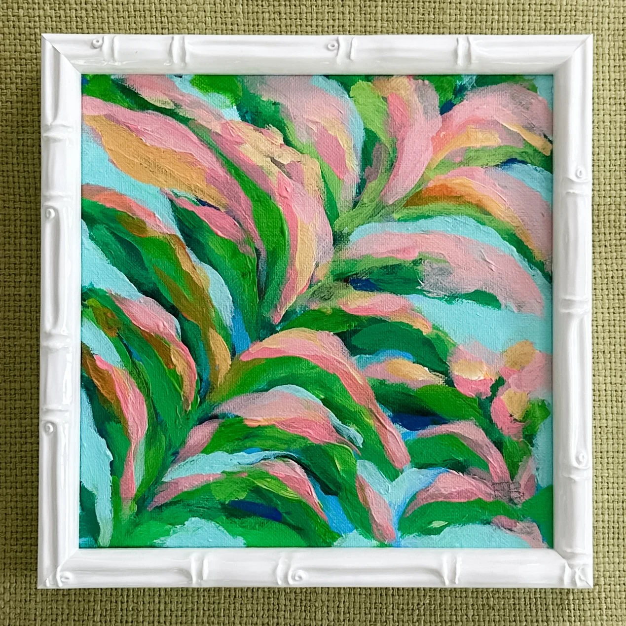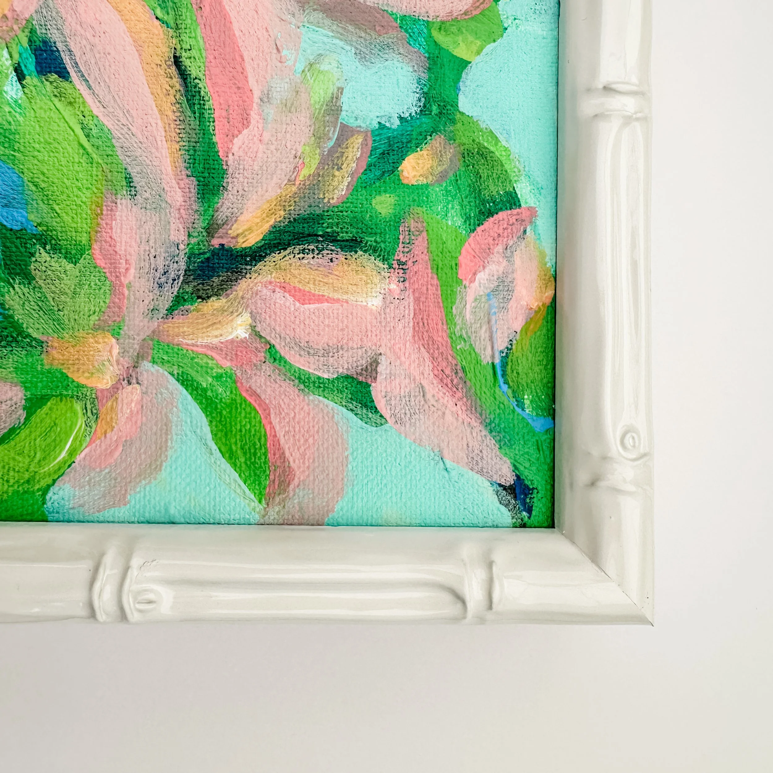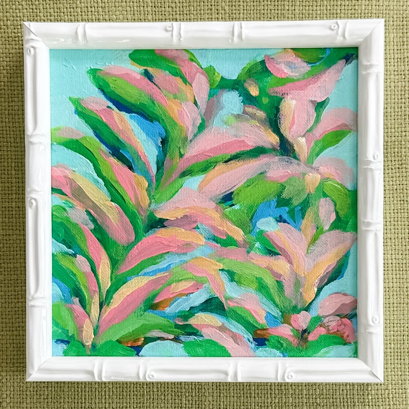 mixed media with gold leaf on canvas, framed in a contemporary matte white floater frame. Wired and ready to hang.