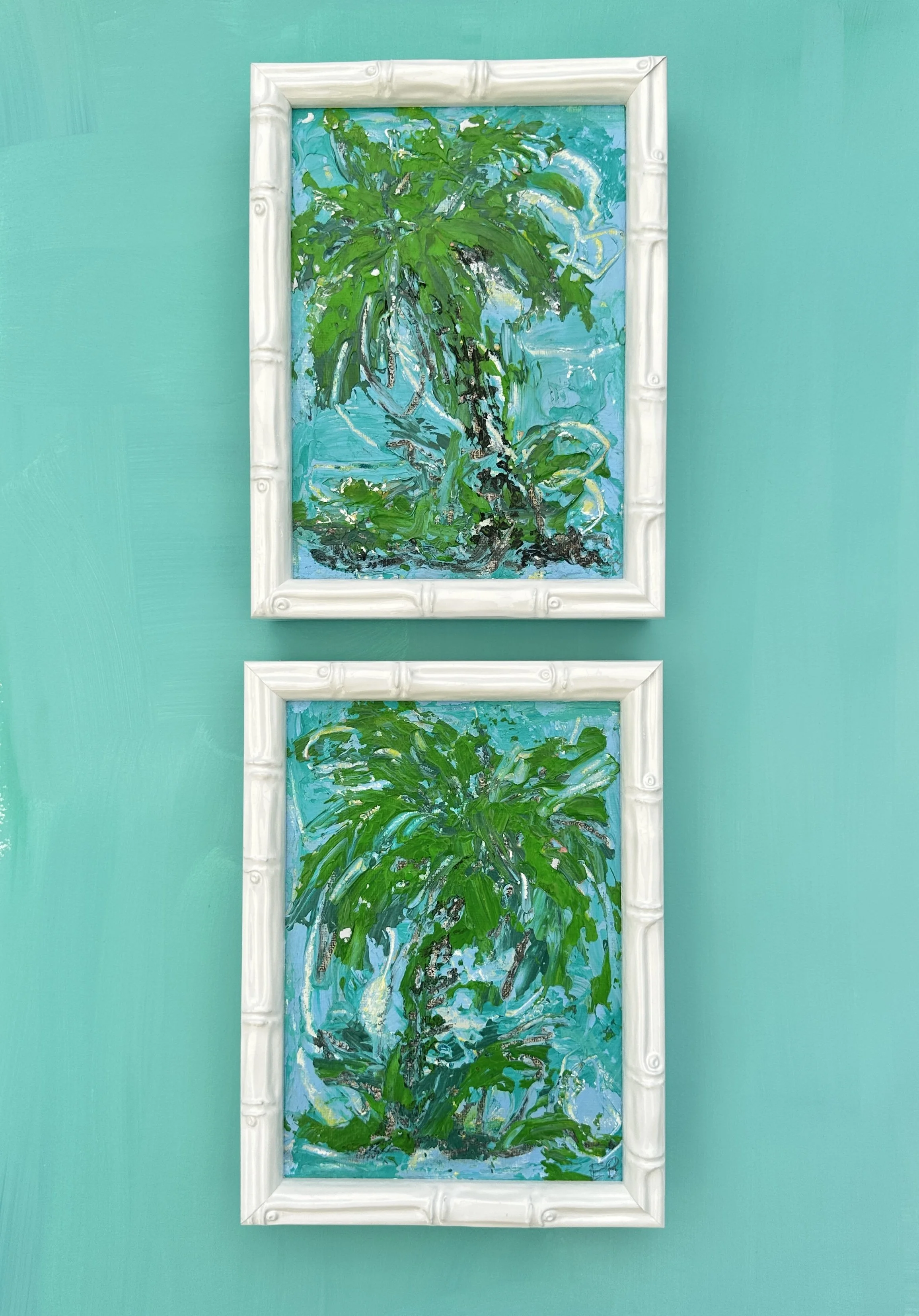 textured mixed media on canvas panel, beautifully presented in a hand-finished Italian glossy white lacquer faux bamboo frame